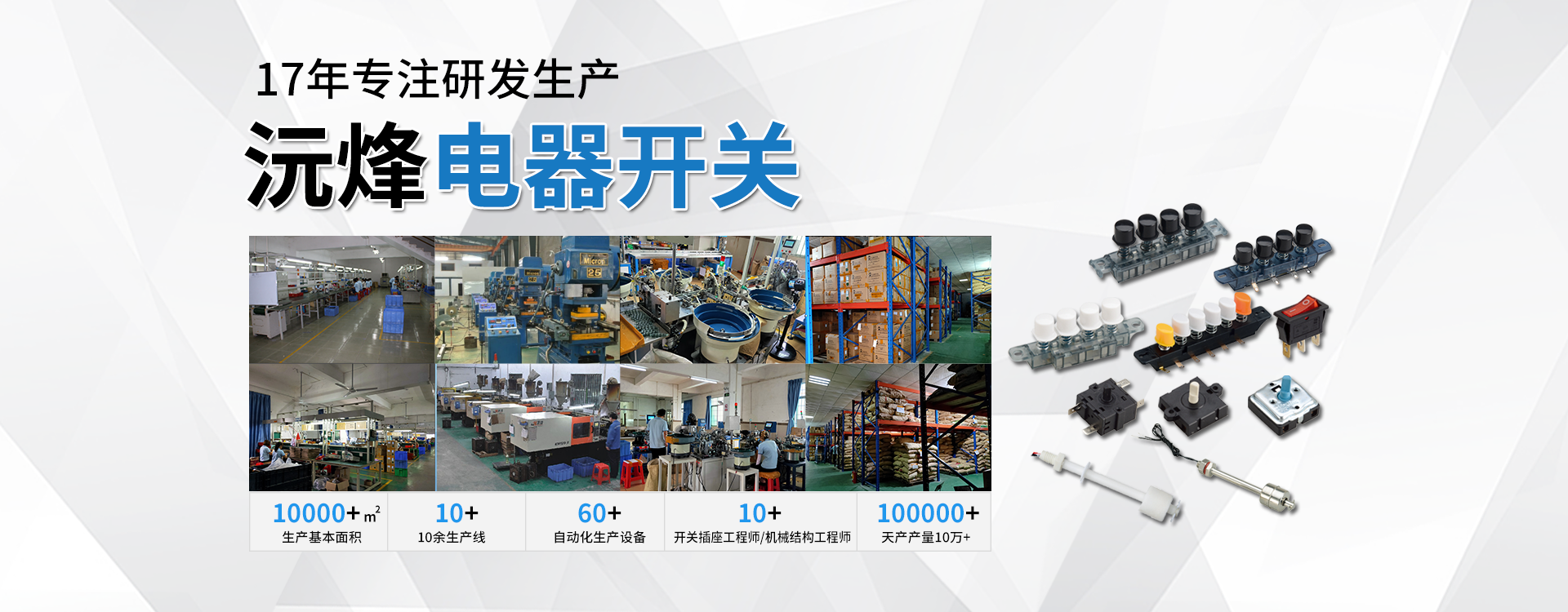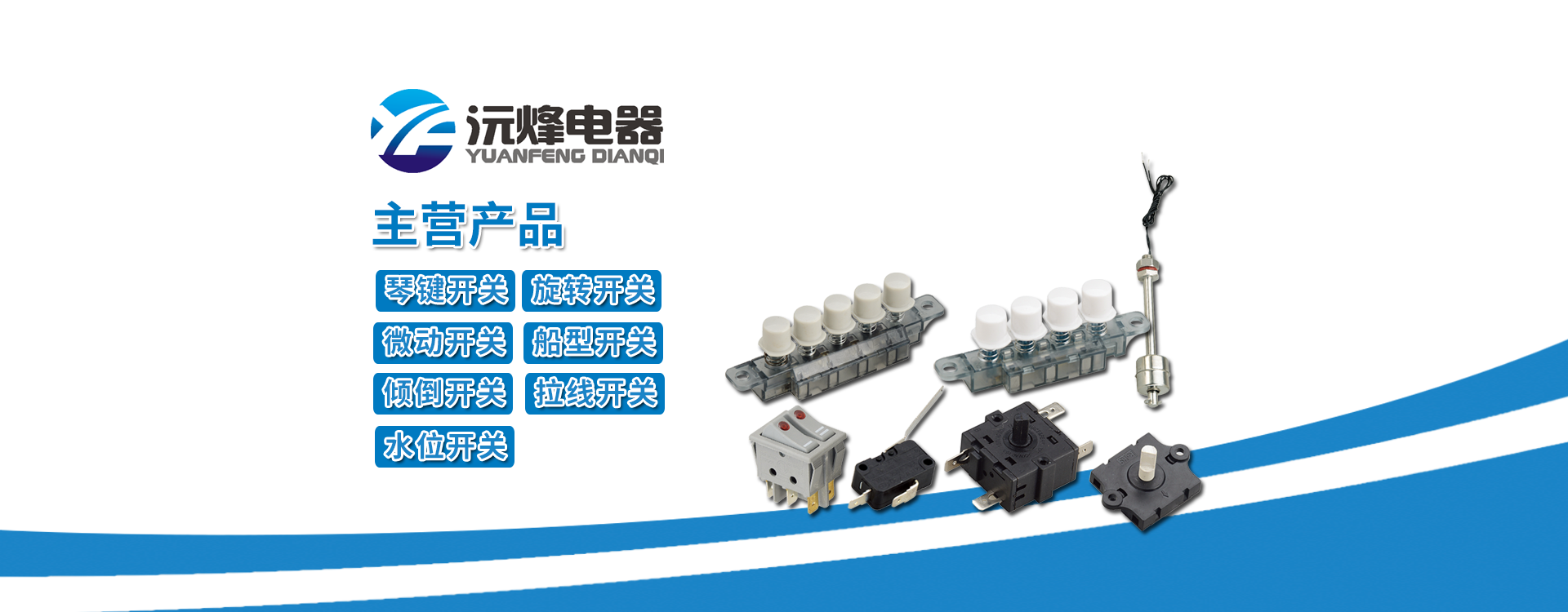 主要生產(chǎn)浮球開關(guān)、接近開關(guān)、琴鍵開關(guān)、旋轉(zhuǎn)開關(guān)、微動開關(guān)、船型開關(guān)、拉線開關(guān)以及接線座等系列產(chǎn)品。 -